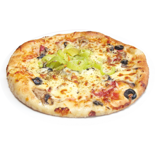 шунка, колбас, пушени гърди, гъби, пипер, доматен сос, моцарела, маслини