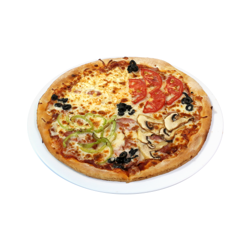 колбас, шунка, сирене, моцарела, маслини, чушки, домати, гъби, доматен сос