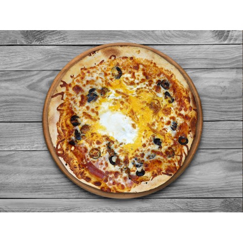шунка, яйце, сирене, моцарела, доматен сос, маслини