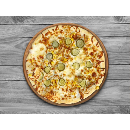 доматен сос, моцарела, шунка, царевица, кисели краставички