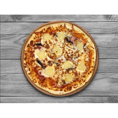 шунка, пушени гърди, гъби, доматен сос, моцарела, ананас