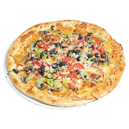 моцарела, маслини, пармезан, гъби, лук, чесън, домат, чушки, доматен сос