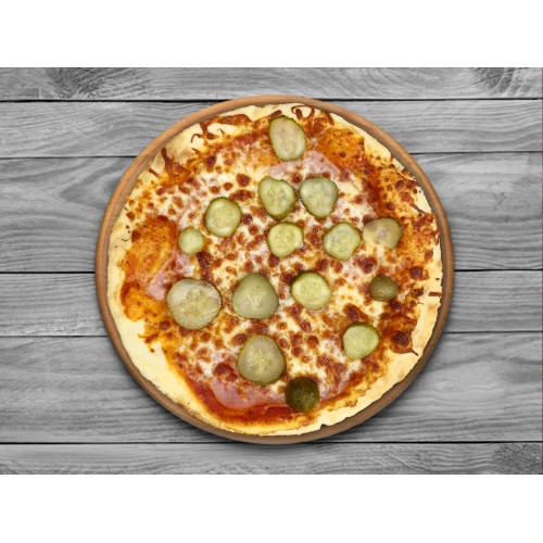 доматен сос, моцарела, шунка, царевица, кисели краставички