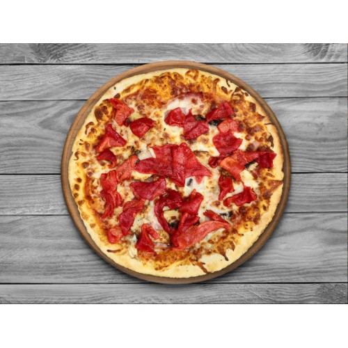 шунка, колбас, пушени гърди, гъби, пипер, доматен сос, моцарела, маслини